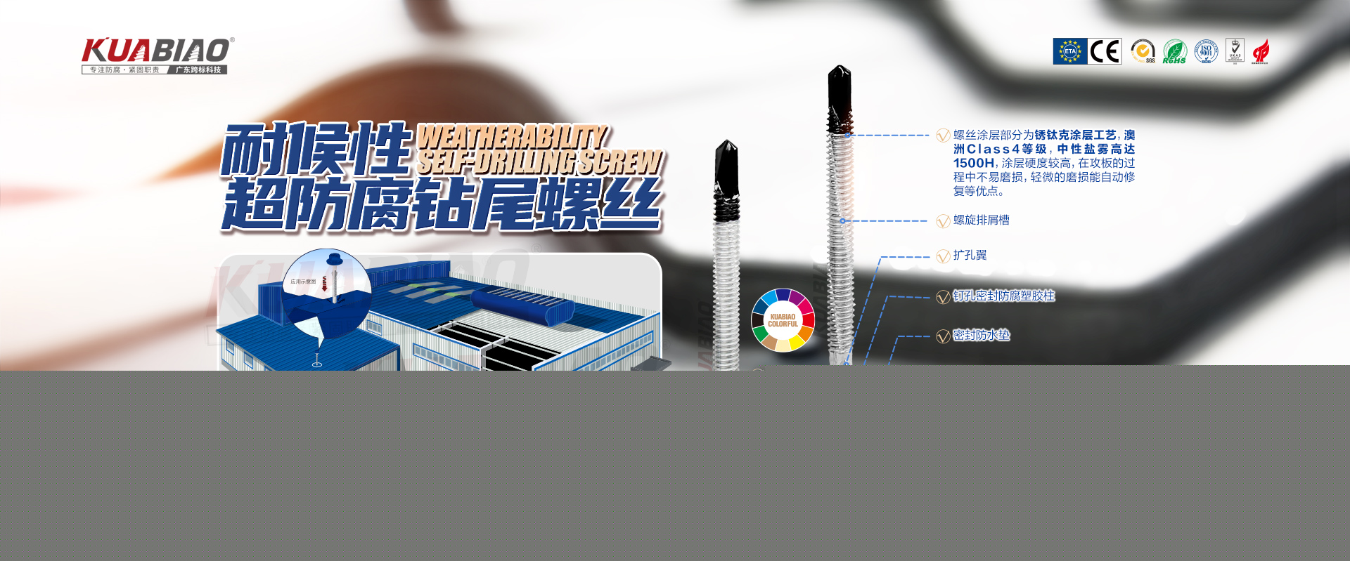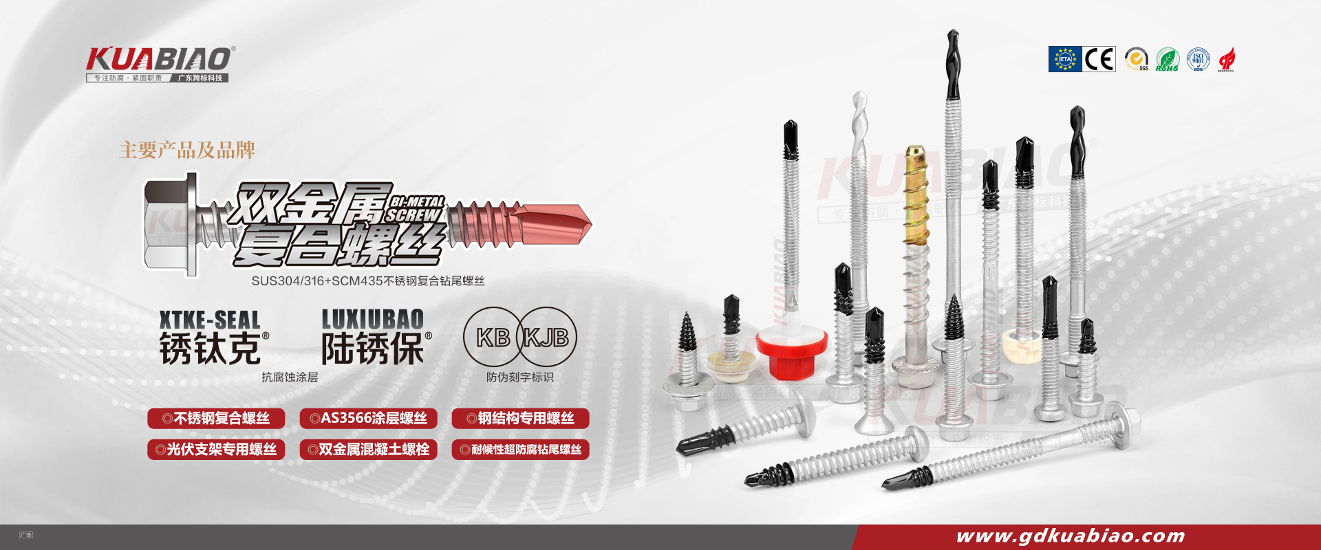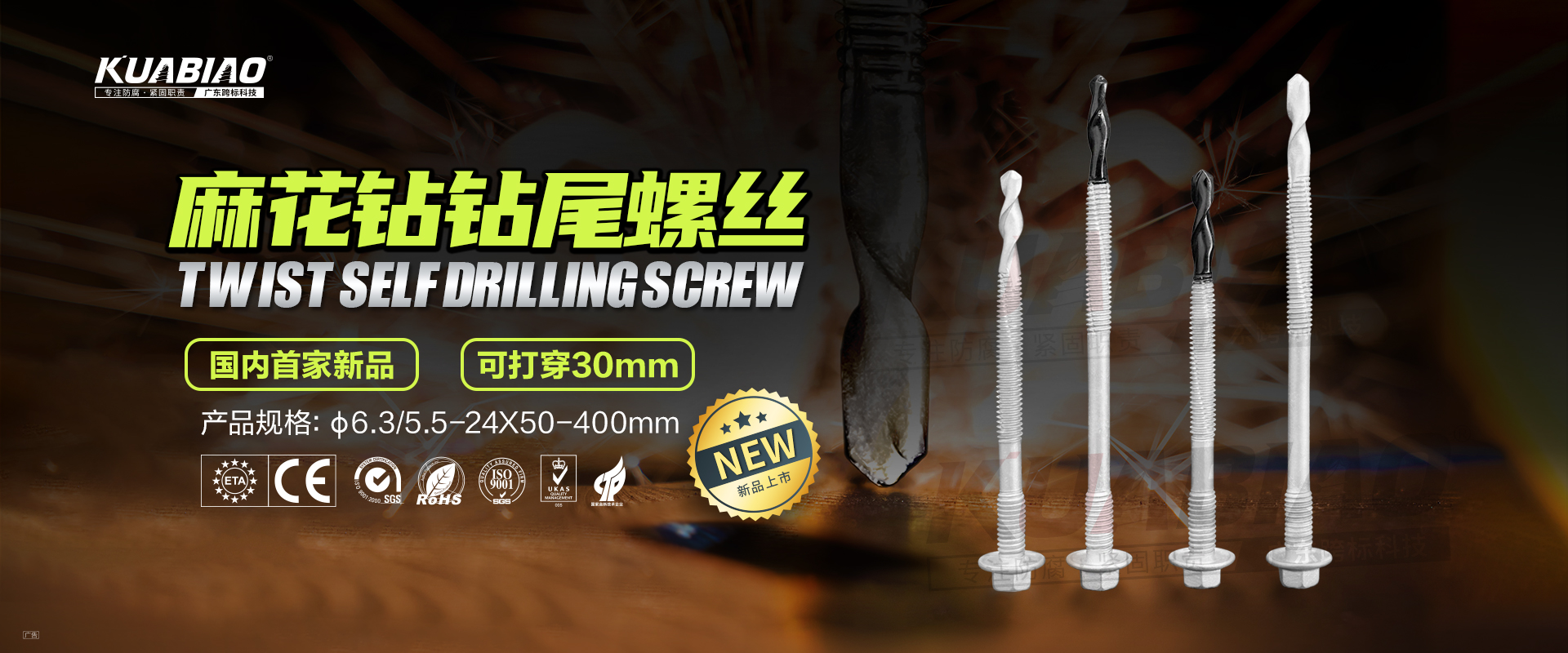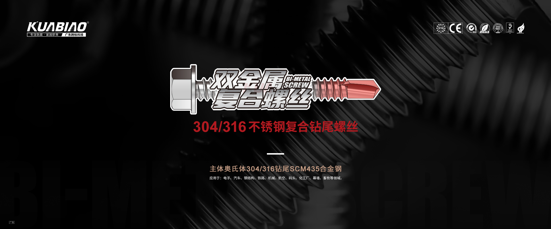 廣東跨標(biāo)建筑科技有限公司原(東莞市跨標(biāo)不銹鋼緊固件有限公司)成立于2005年。專注于高品質(zhì)碳鋼、不銹鋼緊固件的生產(chǎn)及銷售;公司又于2013年成立雙金屬?gòu)?fù)合螺絲生產(chǎn)車間,是國(guó)內(nèi)雙金屬?gòu)?fù)合螺絲的專業(yè)生產(chǎn)企業(yè)。主要生產(chǎn)復(fù)合螺絲,涂層螺絲(澳洲標(biāo)準(zhǔn)),不銹鋼螺絲,螺栓,不銹鋼鉚釘。