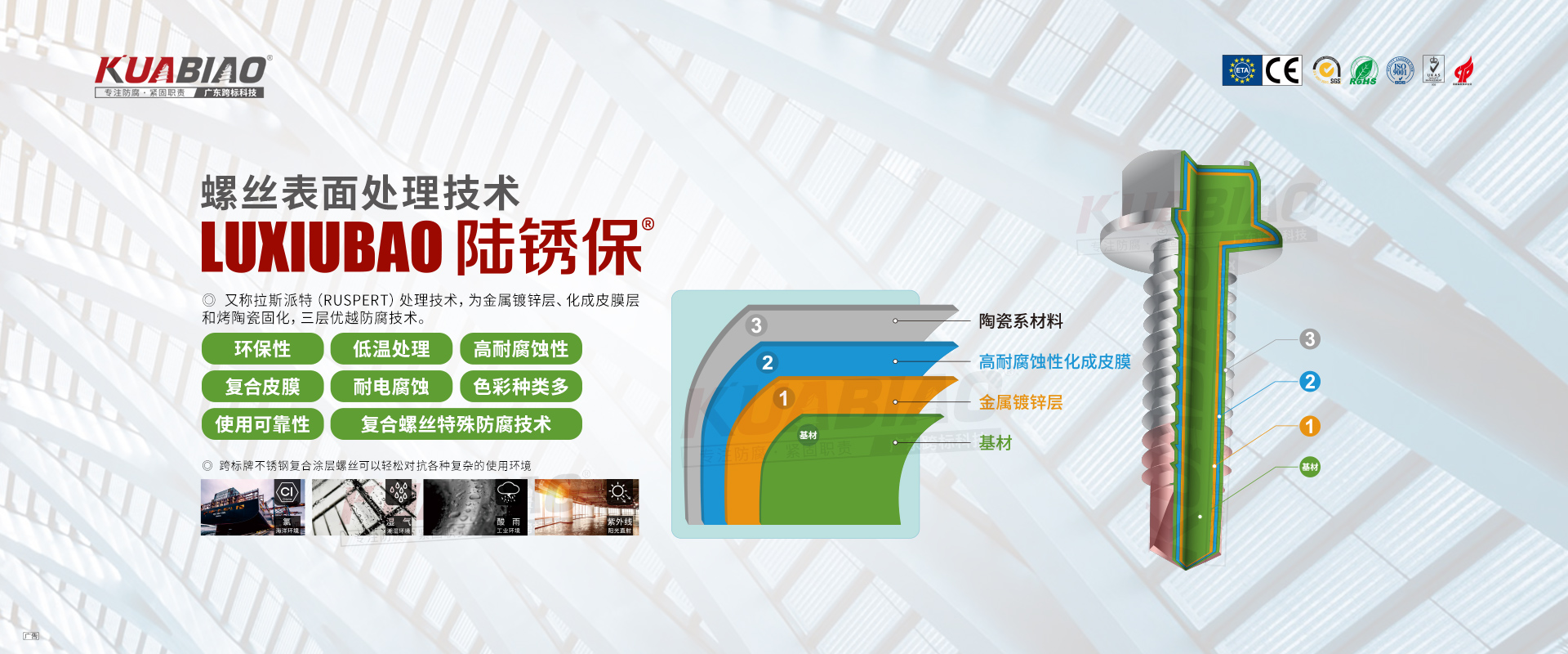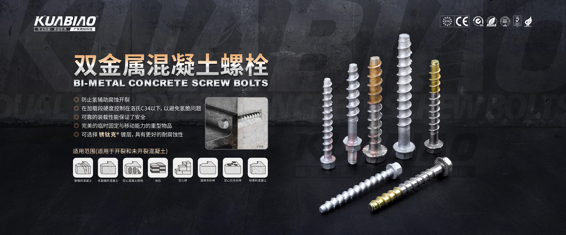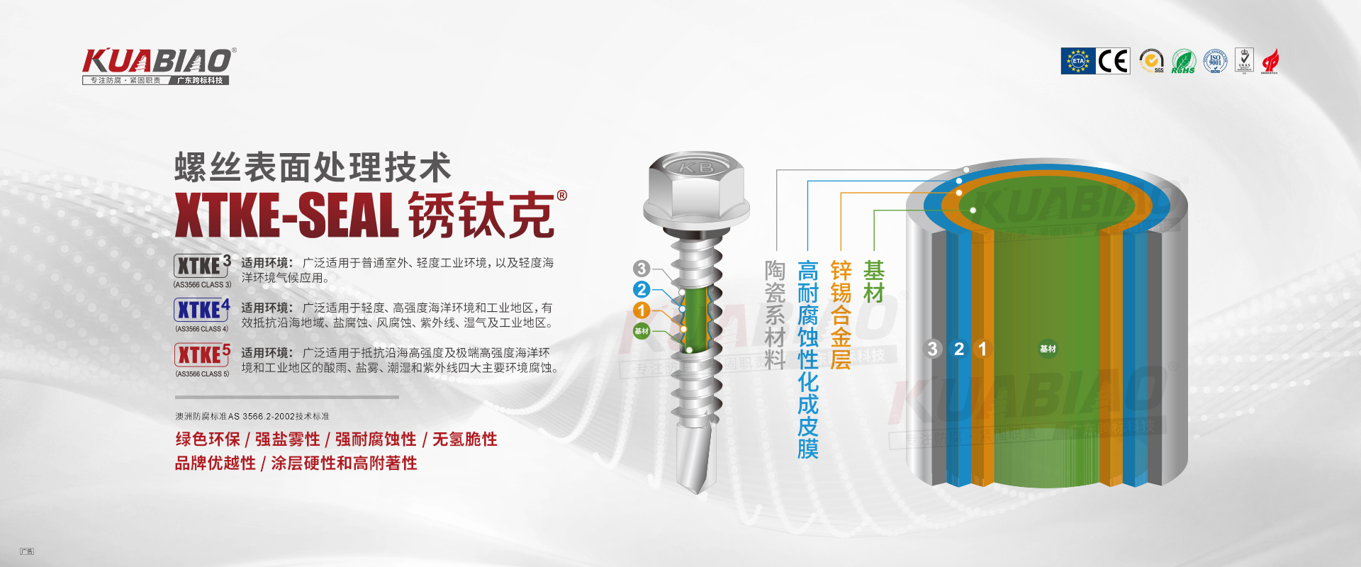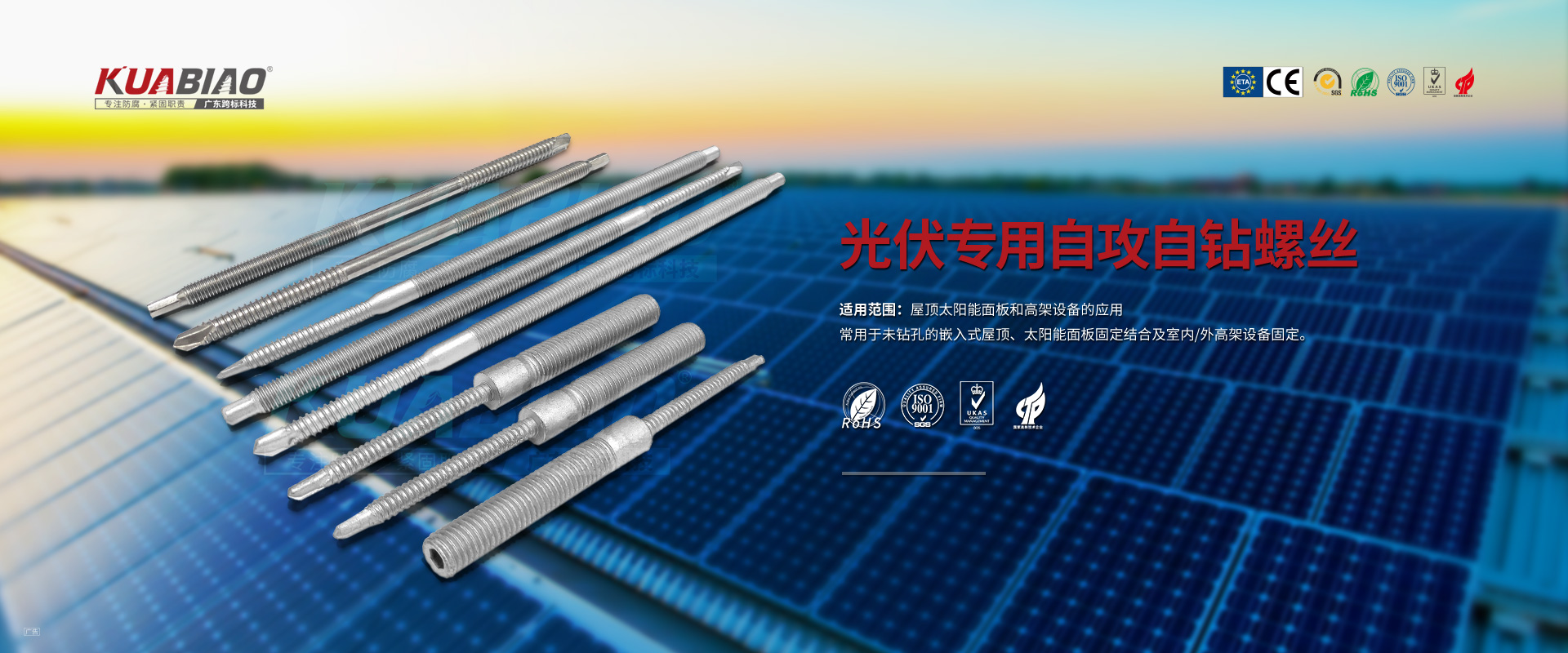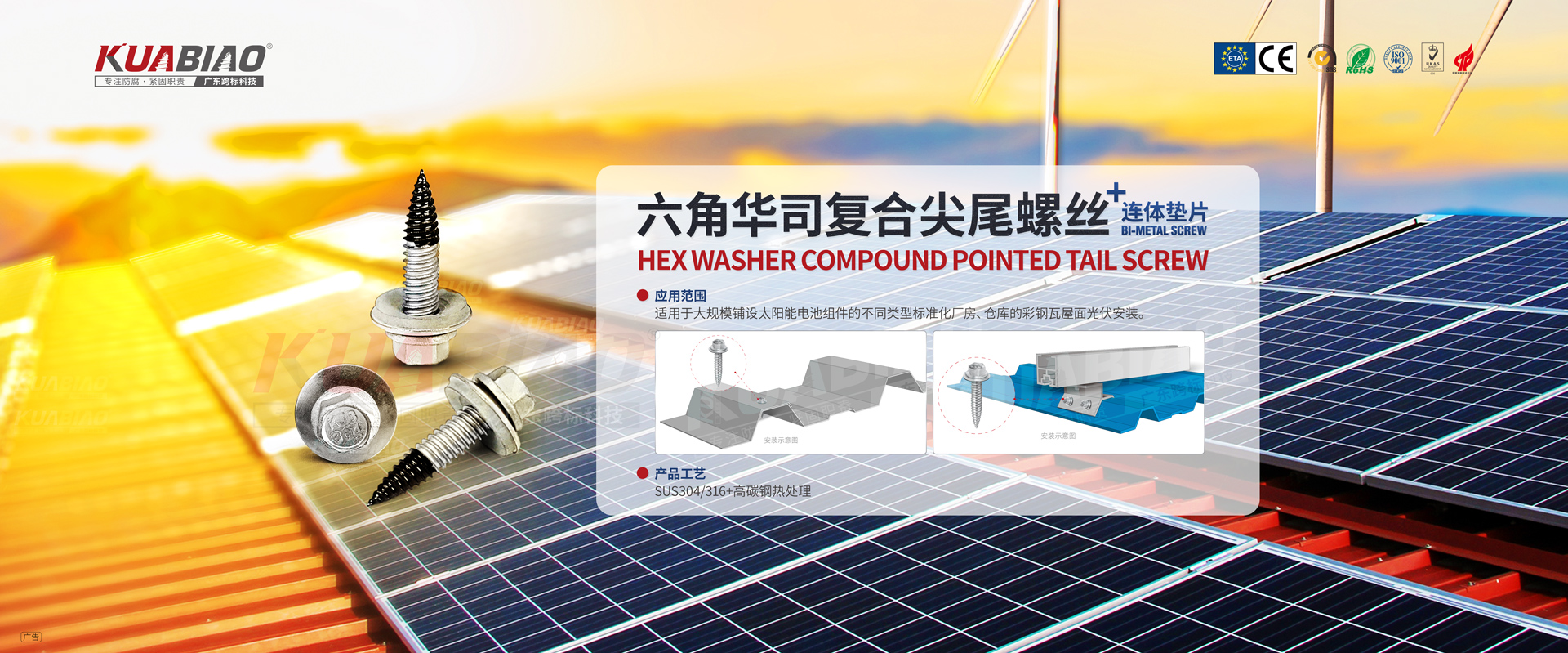 廣東跨標(biāo)建筑科技有限公司原(東莞市跨標(biāo)不銹鋼緊固件有限公司)成立于2005年。專注于高品質(zhì)碳鋼、不銹鋼緊固件的生產(chǎn)及銷售;公司又于2013年成立雙金屬?gòu)?fù)合螺絲生產(chǎn)車間,是國(guó)內(nèi)雙金屬?gòu)?fù)合螺絲的專業(yè)生產(chǎn)企業(yè)。主要生產(chǎn)復(fù)合螺絲,涂層螺絲(澳洲標(biāo)準(zhǔn)),不銹鋼螺絲,螺栓,不銹鋼鉚釘。